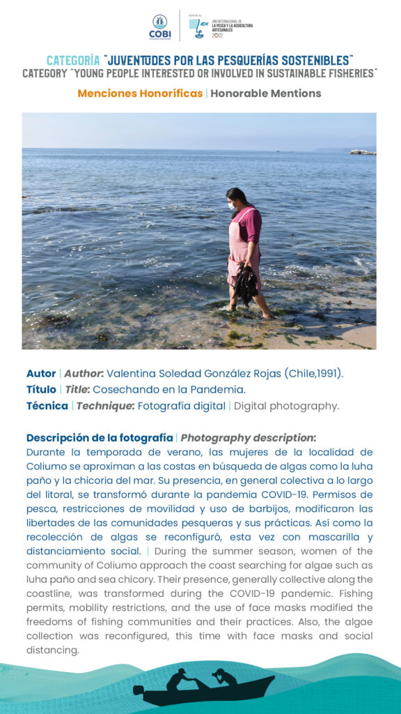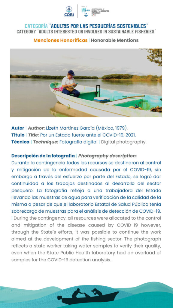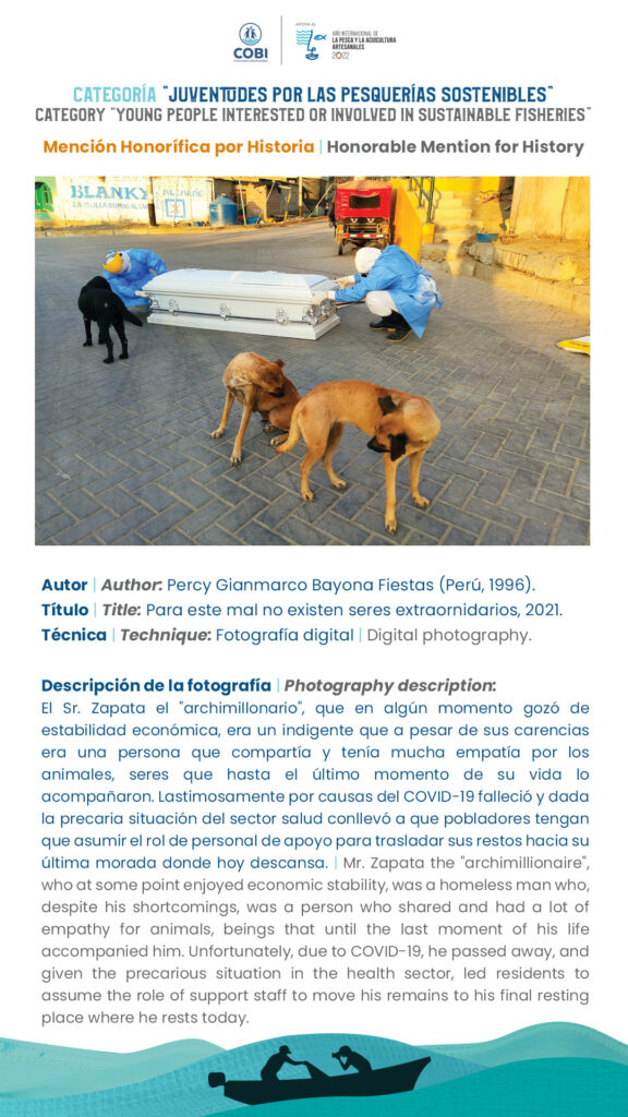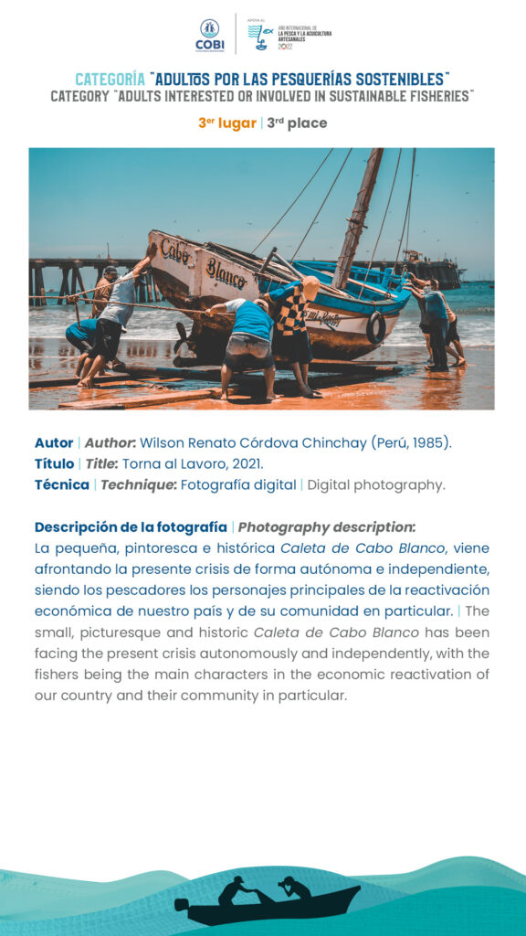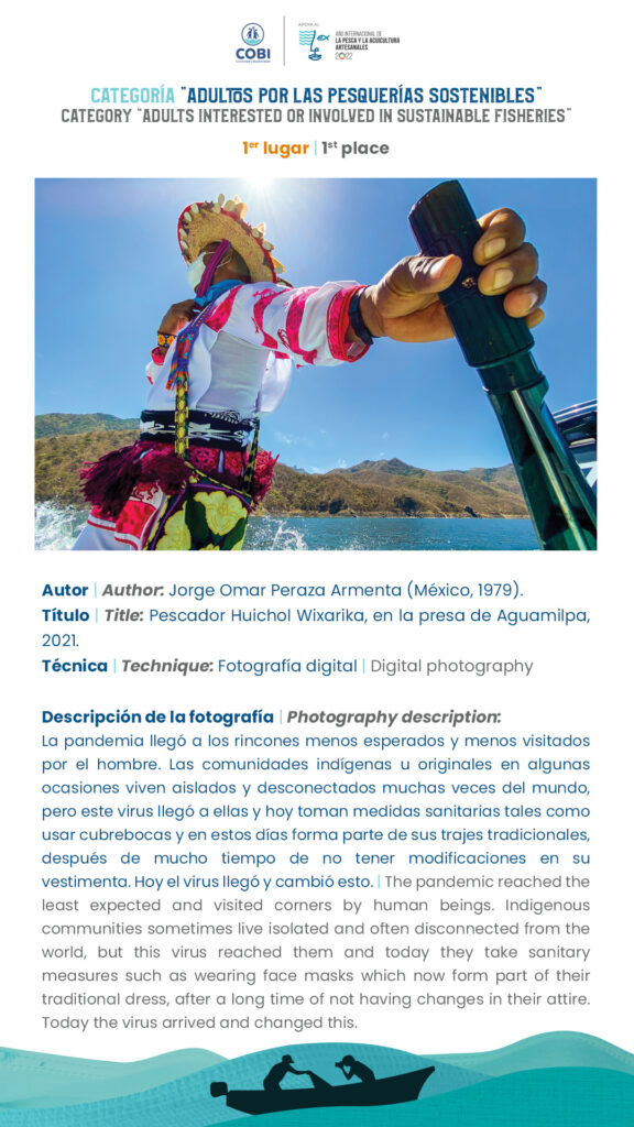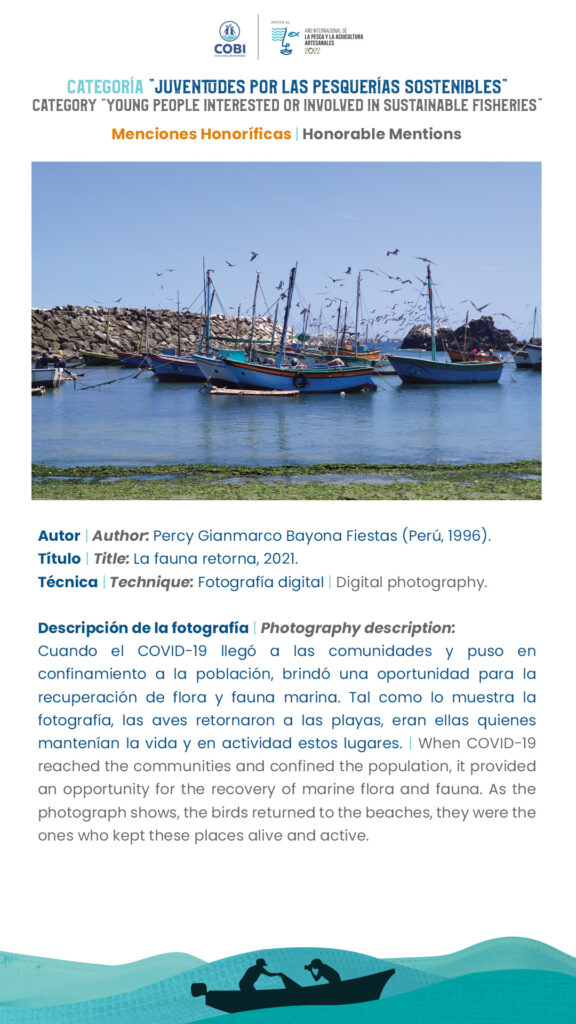 A través de la presente exposición, y en el Marco del Año Internacional de la Pesca y la Acuicultura Artesanales, les invitamos a conocer las fotografías que resultaron ganadoras de este significativo concurso, representando distintos ejes temáticos enmarcados en la pandemia por COVID-19, tales como impactos económicos sociales, el rol del Estado, soluciones locales, género y pesquerías, acceso a servicios de salud, la brecha digital, impactos ambientales y cómo es la nueva normalidad en la pesca.
