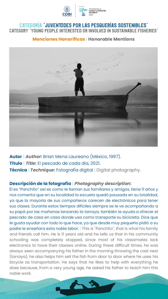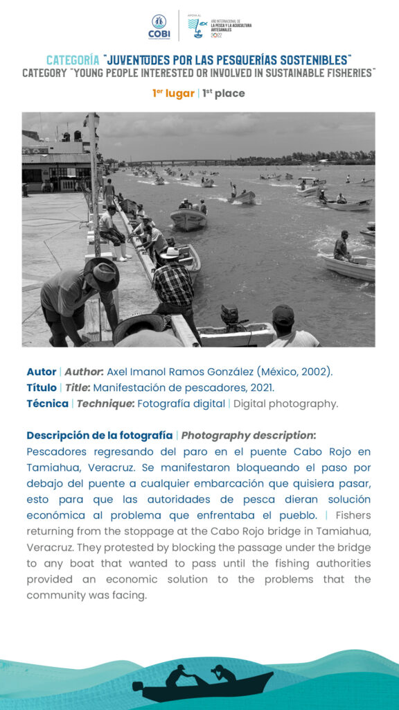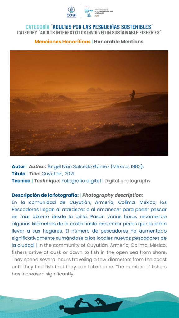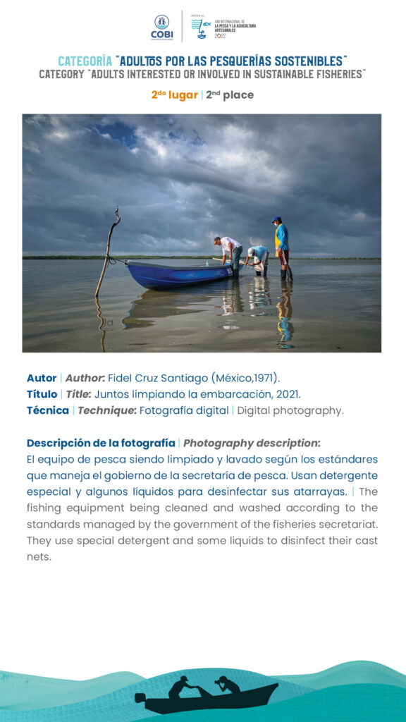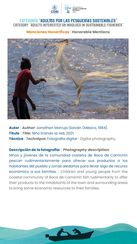 Al cierre de la convocatoria, recibimos más de 100 fotografías de nueve países de América Latina: Brasil, Chile, Colombia, Ecuador, El Salvador, Guatemala, Hondura, México y Perú, mismas que se agruparon en las categorías de 1) Juventudes por las pesquerías sostenibles y 2) Adultos por las pesquerías sostenibles. Con el apoyo de un jurado calificador multidisciplinario formado por cinco personas con experiencia en fotografía, pesca y sostenibilidad, se definieron tres primeros lugares y cinco menciones honoríficas por categoría.