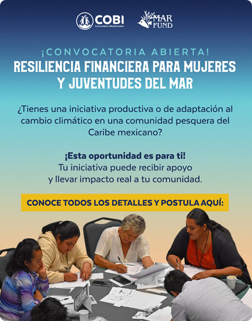 Comunidad y Biodiversidad, A.C. (COBI) invita a participar en la presente convocatoria para presentar y fortalecer iniciativas productivas o de adaptación al cambio climático, con el objetivo de potenciar las capacidades financieras y digitales de mujeres y juventudes en comunidades pesqueras del Caribe mexicano, promoviendo su autonomía, liderazgo, así como participación activa en la sostenibilidad y resiliencia de sus comunidades. Al finalizar el proceso, tras una evaluación y selección, se otorgará un fondo semilla a las dos iniciativas mejor valoradas.
